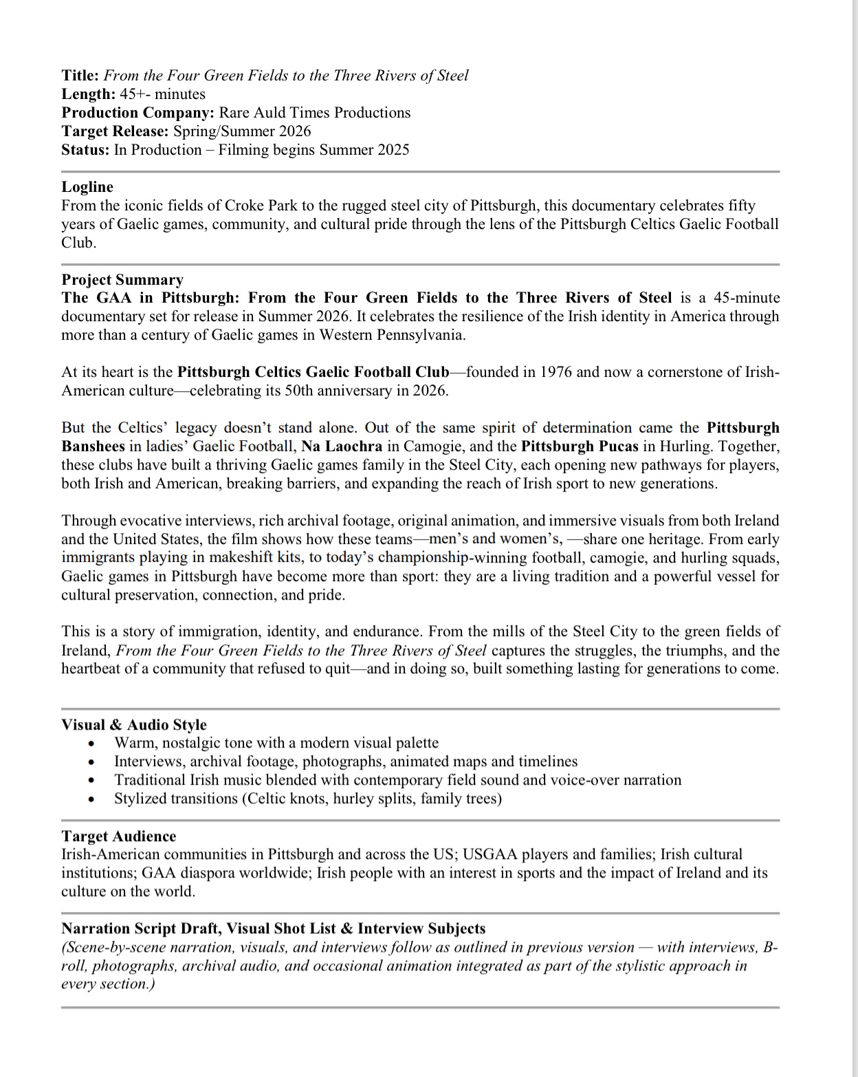 From the iconic fields of Croke Park to the rugged steel city of Pittsburgh, this documentary celebrates fifty years of Gaelic games, community, and cultural pride through the lens of the Pittsburgh Celtics Gaelic Football